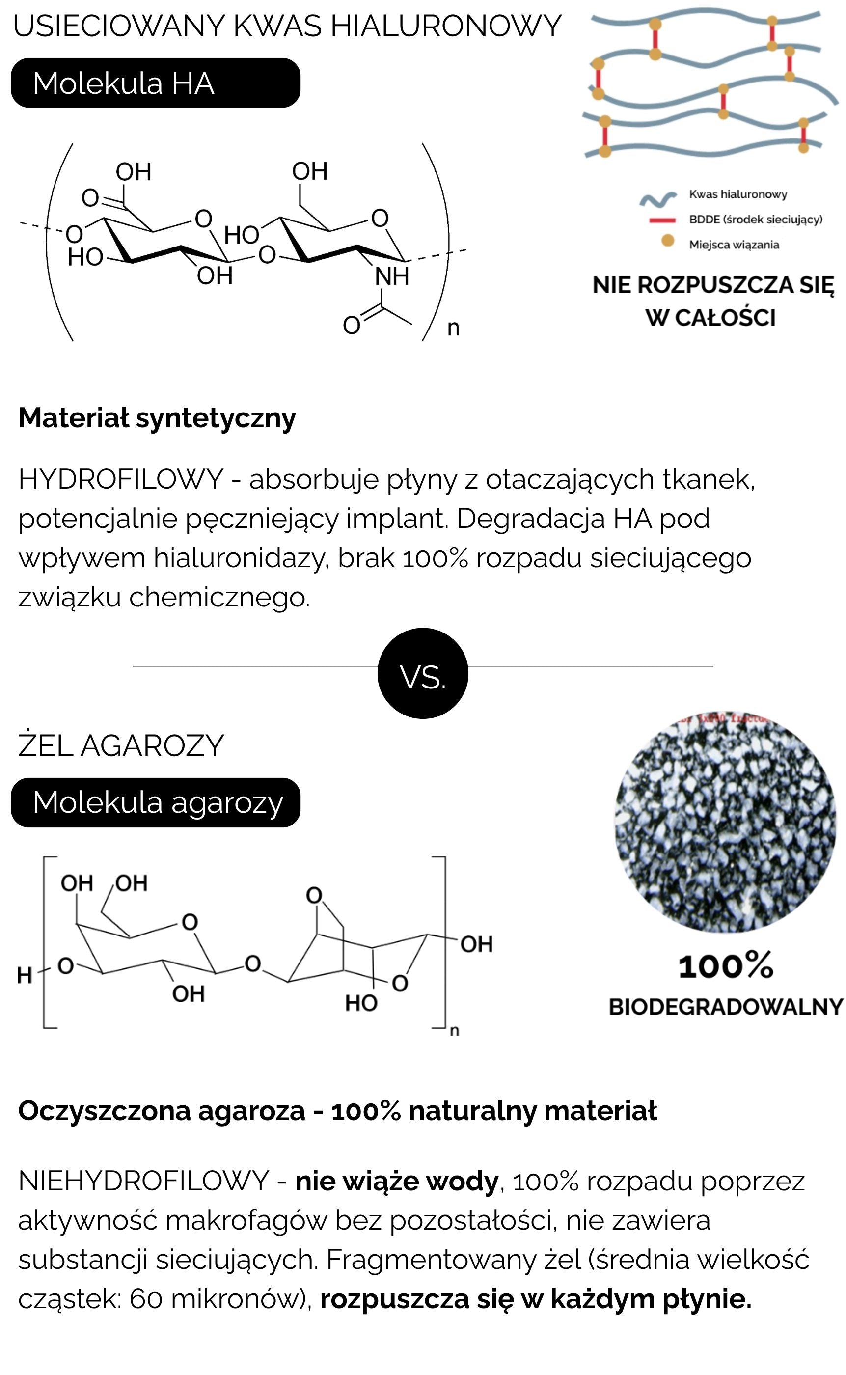 Agaroza – to bezbarwny, nietoksyczny żel, nie zawierający żadnych białek będący wolny od bakterii oraz substancji chemicznych takich jak BDDE czy PEG, gdyż nie jest sieciowany jak wypełniacze z kwasem hialuronowym.
