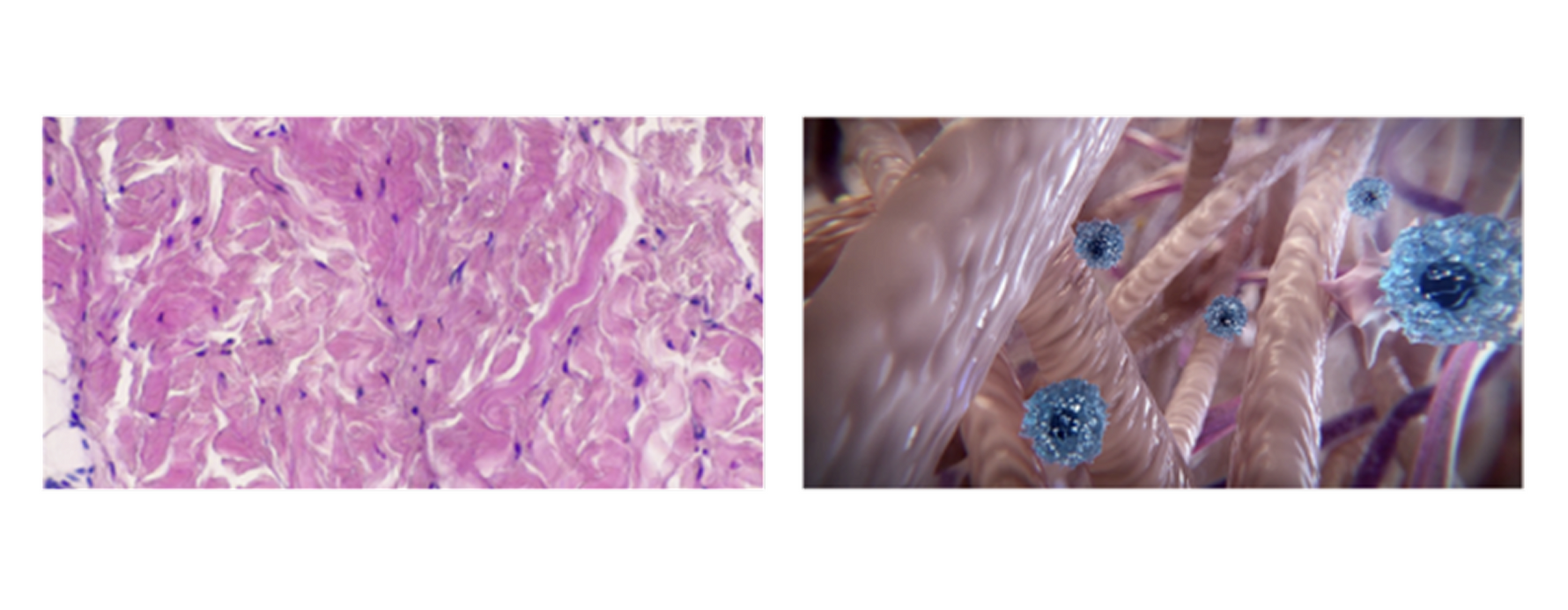 Po 12 miesiącach można zaobserwować grube wiązki kolagenu i liczne fibroblasty.